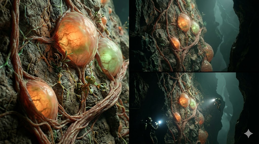 この考え方によれば、現在人類が住んでいる孤島「オースの大地」は単なる岩の塊ではなく、この巨大な生命体が寄生するための「宿主(苗床)」にすぎません。オースにぽっかりと開いた大穴こそが、この寄生生物の「口」であり、本体への入り口なのです。内部に広がる常識外れの特異な植物群や、各層で独自の凶暴な進化を遂げた巨大な原生生物たちは、巨大生物を構成する「細胞」や、体内環境を維持するための「腸内細菌叢(マイクロバイオーム)」のようなものだと捉えることができます。