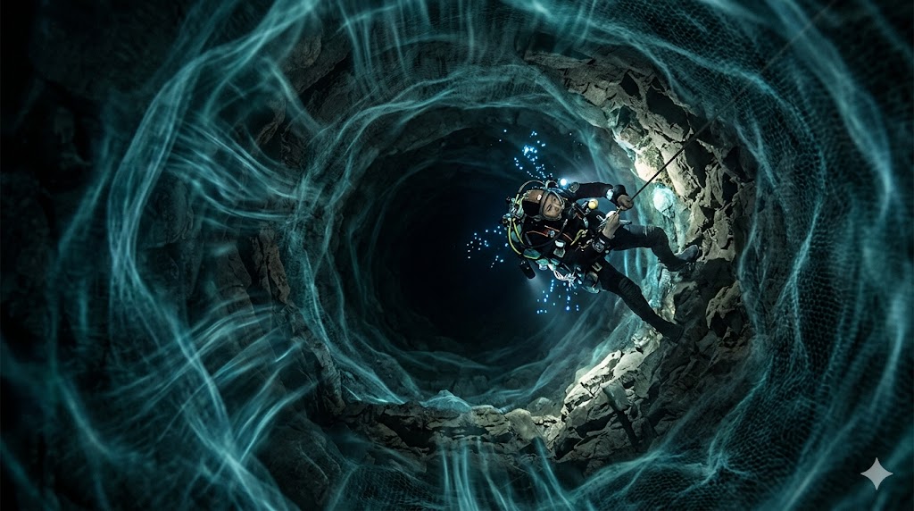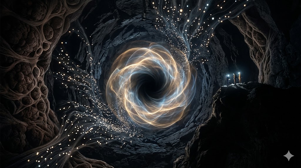 力場が上から下へと中心に向かって流れているのは、それが「死者の魂」を底へと導き、還すための軌道だからです。本来、生きている人間(生者)がこの逆行を試みたり、ましてや魂の還る場所へ自ら降りていく行為は、この世界の自然の摂理における「重大なエラー」に他なりません。生者が不法侵入しているからこそ、強烈な拒絶反応(呪い)が働くのであり、アビスへ降下するという行為は、人間の生を否定し、根源へ退行する究極の自己破壊の旅でもあるのです。