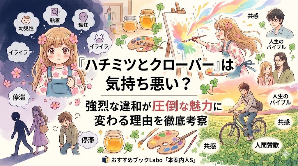 青春群像劇の金字塔として長く愛されている本作ですが、ネット上で、ハチミツとクローバーが気持ち悪いといった声が少なからず存在しているのをご存知でしょうか。調べてみると、ヒロインのはぐみが子供っぽくて過剰な幼児性に違和感を覚えるという意見や、花本先生との結末がどうしても納得いかないという不満が目立っています。さらに、真山の行動がストーカー的で執着に恐怖を感じる、主人公の竹本にイライラするし嫌いになってしまう、登場人物たちが青春ゾンビのように停滞していてまどろっこしいといった、かなりリアルな拒絶反応も少なくありません。この記事では、そうしたネガティブな感情がなぜ生まれるのか、その裏側にある読者の心理を徹底的に深掘りしていきます。実は、この不快感や違和感こそが、他の作品にはない圧倒的な人間ドラマを生み出すフックになっているのです。読み終える頃には、あなたが感じていたもやもやの正体がクリアになり、作品の新しい見え方に出会えるはずですよ。
