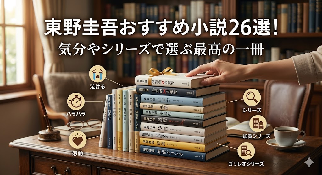 こんにちは。おすすめブックLabo運営者の「本案内人S」です。東野圭吾さんの作品って本当にたくさんあって、どれから読めばいいか迷ってしまいますよね。東野圭吾おすすめ小説を探していると、初心者でも読みやすい名作ランキングや、涙が止まらない泣けるミステリ、さらには最新の映画化作品の原作や人気シリーズを読む順番について知りたいという方も多いかなと思います。この記事では、あなたの今の気分や状況にぴったり合う、最高の読書体験ができる名作を厳選してご紹介します。数ある全作品の中から、あなたにとっての特別な一冊がきっと見つかるはずですよ。