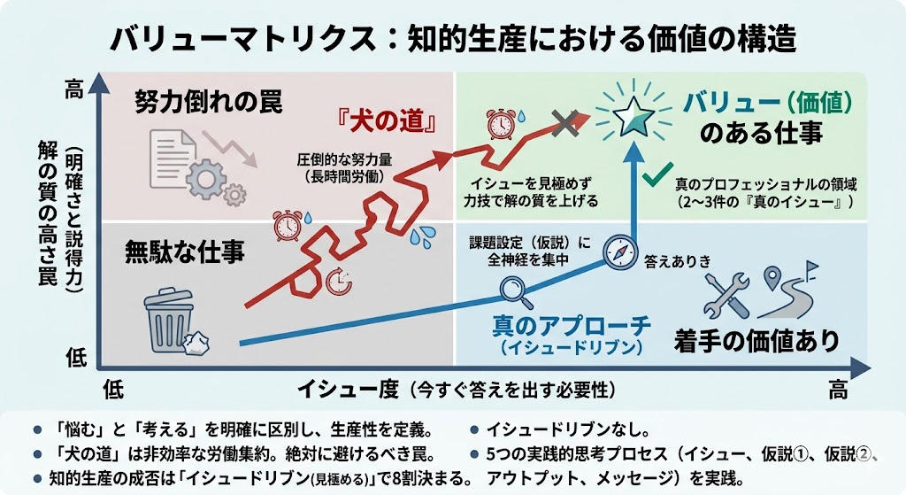犬の道を突き進むことは、結局のところ「質の低いアウトプットを大量に食い散らかす」結果にしか繋がりません。いくら根性に頼って労働時間を増やしたところで、人間の体力や集中力には物理的な限界があり、真のバリュー(右上)には決して届かないのです。さらに深刻なのは、この働き方を続ける限り「本質的な課題を見極める視座」が養われないため、いつまで経っても作業者の枠から抜け出せないことです。