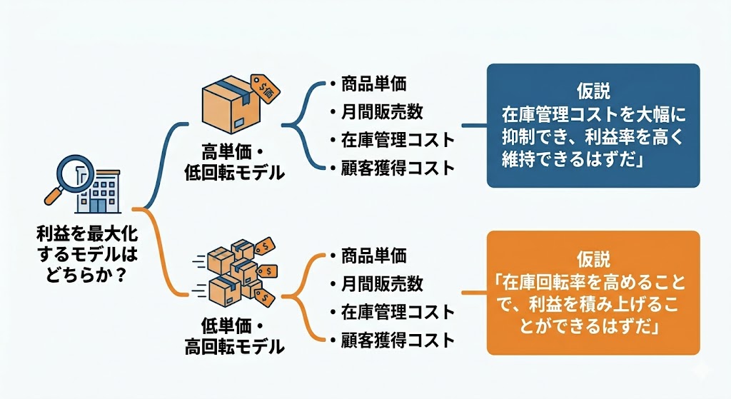 さらに重要なのが、同時に「仮説」を立てることです。仮説は必ず「高単価・低回転のモデルの方が、在庫管理コストを大幅に抑制でき、結果として利益率を高く維持できるはずだ」といった「断定形」で書き出します。仮説を断定することで、「では、他社の在庫管理コストのデータと利益率の相関関係を調べれば証明できるな」と、今日やるべきアクションが自動的に決まるのです。
