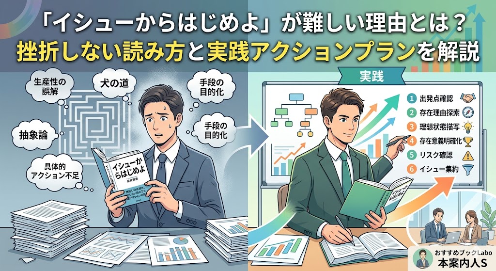 名著として名高い本書ですが、ネットで検索するとイシューからはじめよ難しいという声が意外と多いことに気づきます。実際、読者の中には、ビジネス書の初心者だからわかりやすい解説が欲しいと悩む方や、図解で思考を整理したいと考える方がたくさんいらっしゃいます。また、途中で挫折しないための読み方や、日々の業務で活用するためのコツを知りたいという方も少なくありません。頭では理解できてもなかなか実践に移せないという壁を感じ、具体的なアクションプランの作成や思考の習慣化に苦労している様子が伺えます。サジェストや関連キーワードを調べてみると、多くの方が同じような悩みで行き詰まっており、身近な具体例を交えた解説を求めていることがよくわかります。この記事では、そんな壁にぶつかっているあなたが、明日から現場で使えるスキルとして本書の内容を落とし込めるよう、丁寧にナビゲートしていきますね。